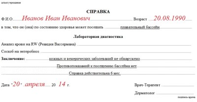 Терапевт, который подписывает справку, ставит печать и выдает разрешение на посещение бассейна, несет определенную ответственность, как и сама организация, предоставляющая документ и право пройти соответствующее обследование.